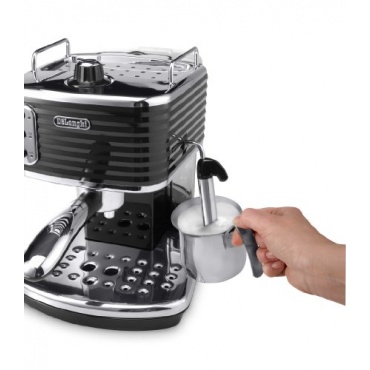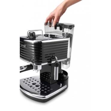 Die ECZ 351.BK Scultura Espressomaschine der Marke DeLonghi ist ausgestattet mit einem Multifunktionssiebträger, dieser ermöglicht vorgemahlenen Kaffee und zusätzlich auch Kaffeepads. Des Weiteren verfügt sie über eine zusätzliche Milchaufschäumdüse für Milchschaum, einen integrierten Kaffeetamper und einen abnehmbaren Wassertank, der ein erleichtertes Reinigen und Befüllen ermöglicht.