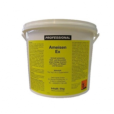 Zur Ameisenbekämpfung im Haus und im Garten hat sich Detia Ameisen-EX bewährt. Es ist ein gebrauchsfertiges Pulvergranulat, das man gießen und auch streuen kann. Es ist geruchsneutral und wird von den Ameisen aufgenommen und an den Nachwuchs verfüttert. Um allerdings Risiken für den Menschen und der Umwelt zu vermeiden, sind die vorgeschriebene Dosierung und die Sicherheitshinweise einzuhalten. Das Produkt ist giftig für Wassertiere.