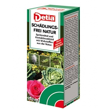 Für die Schädlingsbekämpfung gibt es sehr viele Möglichkeiten. Mit dem Schädlingsfrei Natur von Detia erhalten sie ein Sprüh- und Kontaktinsektizid, dass gegen eine Vielzahl von Schädlingen wirkt wie Weiße Fliege, Zikaden, Spinnmilben, Thripse oder Schmierläuse. Als rein natürliches Mittel eignet es sich sehr gut für die biologische Landwirtschaft. Die 250 ml Insektizid sind ausreichend für 25 Liter Wasser. Bei der Anwendung werden Nützlinge verschont und das Insektizid ist ebenfalls ungefährlich für Bienen.