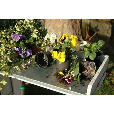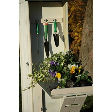 - Dekoratives Erscheinungsbild, wetterfest imprägniertes Kiefernholz, ausklappbarer Pflanztisch mit verzinkter Arbeitsplatte, antik-weißer Schutzanstrich, drei Regalböden und Hakenleiste drei-fach.