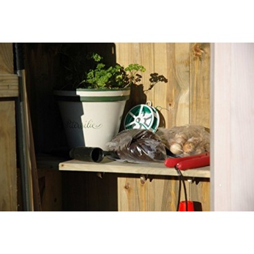 Im Innenbereich verfügt das attraktive Gartenhäschen über drei Regalböden, und eine Leiste mit drei Haken befindet sich an der Außenseite. Das Gerätehaus wird komplett aufgebaut ins Haus geliefert, sodass keine Arbeit entsteht. Wenn der praktische Arbeitstisch einmal nicht benötigt wird, klappt man ihn ganz einfach nach oben, wobei er unsichtbar an der Seite verschwindet. Unter dem speziell behandelten Dach befinden sich zwei Belüftungslöcher. Das Gartengerätehaus nimmt alle Gegenstände auf, die für die Gartenarbeit notwendig sind.