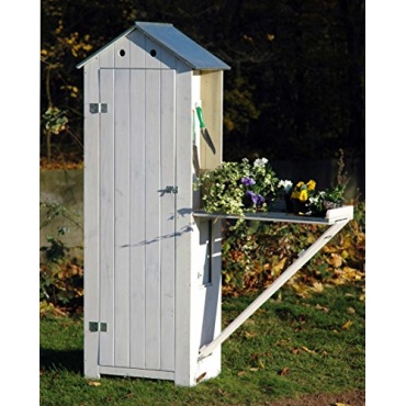 Das schwere Gartengerätehaus dobar 56215 besteht aus massivem wetterfest imprägnierten Kiefernholz. Besonderer Pfiff ist der ausklappbare Pflanzentisch mit einer verzinkten Arbeitsfläche. Mit der antikweißen Lasur besitzt das Holz einen zusätzlichen guten Schutz und somit eine lange Haltbarkeit. Das charmante Haus mit einem Satteldach ist sehr dekorativ und stellt in einem Garten den Blickfang dar.