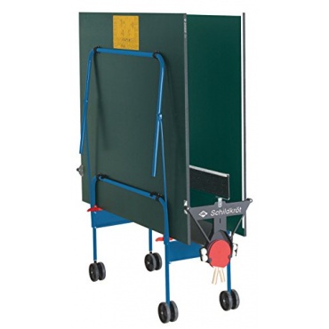 Das Grundgestell bei der Tischtennisplatte ist aus 25 mm starken Rundrohrprofil hergestellt. Zum Schutz ist es kunststoffbeschichtet und in einem blauen Farbton gehalten. Die Tischtennisplatte ist aus einer 19 mm starken Feinspanplatte hergestellt. Sie ist ebenfalls beschichtet und in einem grünen Farbton gehalten. Sie ist mit vier Rädern ausgestattet, dazu gehört auch zwei lenkbare Räder. Die Räder haben einen Durchmesser von 125 mm. Die Spielgröße der Tischtennisplatte liegt bei 274 x 152.5 x 76 cm. Sie wird mit einer Netzgarnitur und einem Ball- und Schlägerhalter geliefert. Die Tischtennisplatte kommt auf ein Gewicht von 65 kg.
