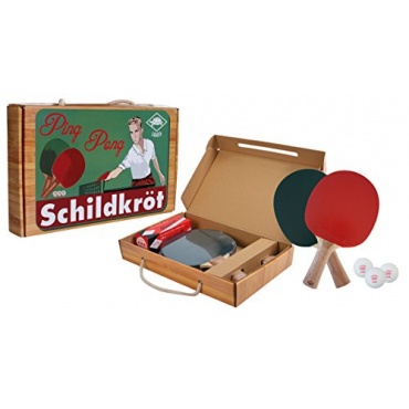 Das Donic-Schildkröt Tischtennis Set hat einen Retro Style. Er beinhaltet zwei Schläger, die einen roten Belag und einen grünen Belag haben. Der Belag besteht aus einem Schwamm. Er hat eine Dicke von 1,8 mm. Die Griffe der Schläger sind aus einem harten Holz hergestellt. Sie sind mit einem SK-Logo versehen. Zusätzlich beinhaltet das Set 3 Bälle. Ein besonderer Vorteil ist die stabile Aufbewahrungsbox, die vor Schmutz und Staub schützt.