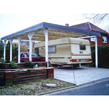 Damit beide Fahrzeuge einen optimalen Platz vor den Witterungen haben und einen Schutz genießen können, ist dieser Carport aus druckimprägniertem Holz genau das Richtige. Mit einer Größe von 600 x 800 cm bietet er Platz für zwei Limousinen. Das attraktive Walmdach gibt diesem Carport ein faszinierendes Aussehen. Der Carport passt sich durch das massive Holz jedem Hausdesign an.