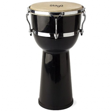 Die schwarze Djembe aus Fiberglas von Stagg ist ein besonders elegantes Instrument, dass sich durch seinen glatten Körper in schwarzem Hochglanz auszeichnet. Der Körper ist aus Fiberglas in einem Stück gestaltet. Das Trommelfell besteht aus handverlesenen Tierfellen und ist mit einem Spannrahmen am Körper befestigt. Zum leichten Stimmen des Instruments wird ein Stimmschlüssel mitgeliefert. Auch das Auswechseln des Fells gestaltet sich selbst für den Anfänger problemlos.