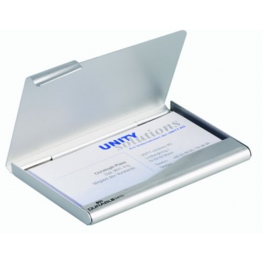 Dieses Visitenkartenetui der Marke Durable besteht aus Aluminium und ist in der Farbvariante metallic silber erhältlich. Es kann bis zu 20 Karten umfassen und die Zugriffsseite ist oben angeordnet. Mit den Maßen 12,4 x 6,8 x 1,4 cm ist das Etui kompakt und platzsparend. Zudem passt es somit auch locker in die Innentasche des Anzugs.