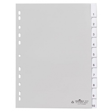 Das Blanko-Register 644110 aus dem Hause Durable gehört zu den auf persönliche Bedürfnisse zugeschnittenen Ordnerregistern. Es ist aus Polypropylen gefertigt und in grauer Farbe, wodurch es sich recht gut von den meisten - üblicherweise weißen - Dokumenten abhebt. Das zehnteilige Vollformat-Register ist mit einer Universal-Lochung versehen, wodurch eine hohe Kompatibilität zu verschiedenen Heftvorrichtungen je nach Ordner erreicht wird.