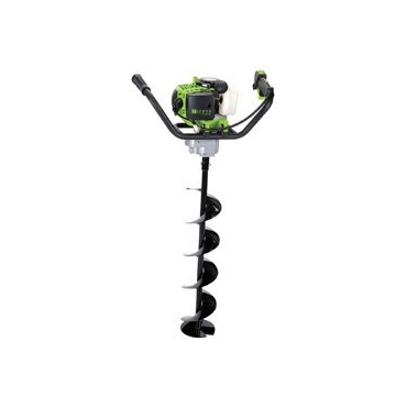 Der 1 Zylinder Zweitakt Motor ist luftgekühlt, die Kupplung arbeitet mit Fliehkraft. Wenn nötig, kann der Bohrer auf maximal 40 cm verlängert werden. Sehr handlich ist der EBO 100H Erdbohrer außerdem durch die beiden Schalter am Handgriff, die für das Gas sowie den Stopp zuständig sind. Zusätzlich zum Erdbohrer gibt es drei Bohrer in den Stärken 100, 150 und 200 mm. Gestartet wird mit einem Seilzug.