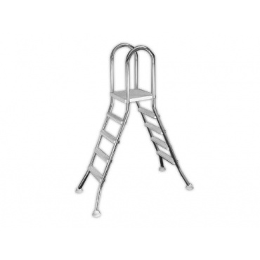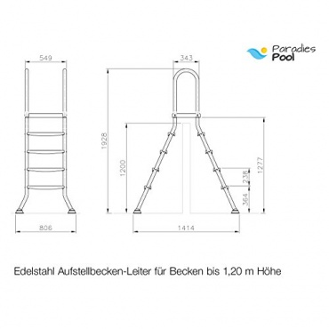 Diese Edelstahl Aufstellleiter eignet sich für Pools bis zu einer Höhe von 1,2 Metern. Das Material ist polierter Edelstahl.Das Podest der Leiter ist mit bis zu 150 Kilogramm belastbar und stabil. Die Kunststoffstufen sind rutschfest.Der Holmdurchmesser beträgt 43 mm. Die Aufstellleiter wird mit stabilen Gummifüßen geliefert.Die Leiter ist selbst stehend und wird nicht befestigt.