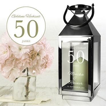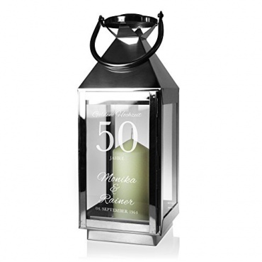 Die silberne Edelstahl Laterne ist ein besonderer Hingucker, wenn man ein besonderes und zugleich persönliches Geschenk zur goldenen Hochzeit sucht. Eine Seite der Laterne ist mit der Gravur "Goldene Hochzeit 50 Jahre" versehen und kann auf Wunsch noch um eine weitere Gravur ergänzt werden. Durch die klaren und großen Gläser verbreitet die Laterne rundherum ein angenehmes, weiches und behagliches Licht.