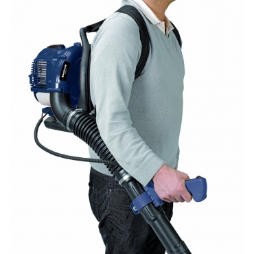 Mit dem Rückentragegurt ist eine entspannte Arbeitshaltung garantiert. Der 2 Takt Motor hat eine Kraft von 0,9 kW / 1,22 PS Mit einem Mischverhältnis von 1:40 bietet er einen optimalen Einsatz. Eine maximale Luftgeschwindigkeit von 250 km/h sorgt für saubere Flächen. Die Motordrehzahl beträgt 8.500-1 und er hat ein Tankvolumen von 0,65 Liter. Mit einem Netto-Gewicht von 6,5 kg ist er auf dem Rücken sehr leicht und angenehm zu tragen.