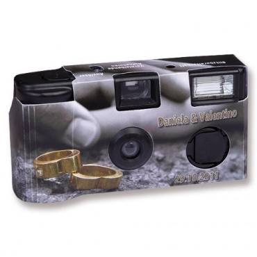 Schon alleine bei dem Anblick dieser Einwegkamera kommen romantische Gefühle auf, denn diese ist in einem sehr schönen schwarz/weiß Bild mit Händen gehalten. Die goldfarbenen Ringe, die hier ebenfalls abgebildet sind, werden zum absoluten Blickfang. Dadurch kann die Kamera, gerade auf Hochzeiten oder zu Verlobungsfeiern, ideal genutzt werden. Überreicht man jedem Gast ein Exemplar, so hat man die Möglichkeit, später aus sehr vielen, unterschiedlichen Bildern auszuwählen.