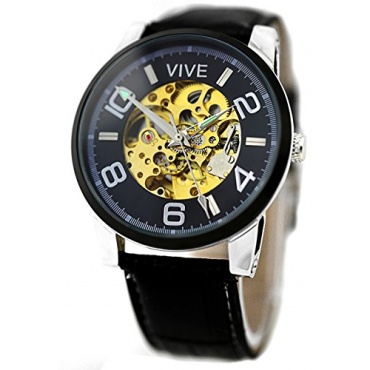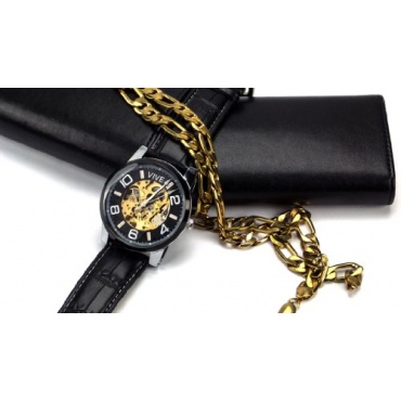 täglichen Handbewegungen des Trägers automatisch aufgezogen. Die Bewegungen lassen die Schwungmasse rotieren und die Zugfeder wird aufgezogen. Diese Uhr ist mit einem skelettierten Zifferblatt in den Farben schwarz - gold und das komplette Innenleben ist zu sehen. Der Glasboden ist stabil und verschraubt.