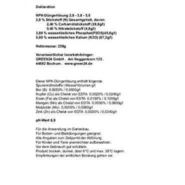 Erhältlich ist der High- Tech Dünger als Konzentrat in einer 250ml Flasche. Der Dünger ist enorm ergiebig und sehr wirkungsvoll. 250ml Düngerkonzentrat sind für 60 bis 125 Liter fertiger Flüssigdünger gedacht. Die Menge des nötigen Konzentrates hängt von der Pflanzenart und deren Zustand ab. Auf jeder Flasche befindet sich eine Gebrauchsanweisung. Der Dünger ist einfach in der Handhabung, die Dosierung ist über die Verschlusskappe möglich. Nicht in der Nähe von Kindern und Tieren lagern.