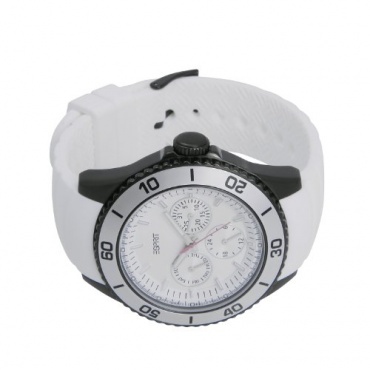 Lebensbejahend, sportlich-chic und außergewöhnlich, so gibt sich die Armbanduhr von Esprit die von Damen und Herren gleichermaßen getragen werden kann. Das klassische Zifferblatt des Chronographen ist von einer Lunette mit Zahlen umgeben und wirkt schlicht und elegant. Der ganz besondere Aspekt der Uhr besteht in dem weißen Armband, das aus Kautschuk gearbeitet ist und mit einer Dornschließe geschlossen wird.