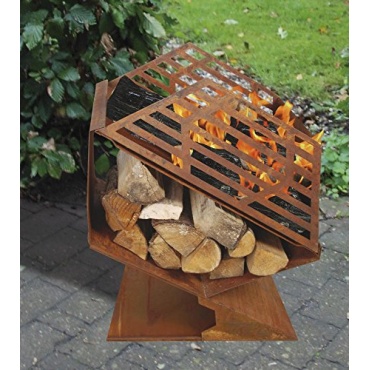 Der aus Metall angefertigte, rostig-braune Terassenofen verfügt über eine Ablage für Brennholz in der unteren Hälfte. Trotz des Metalls wirkt es hölzern und natürlich und bringt eine angenehme Atmosphäre auf das Gelände. Die mit Kohle funktionierende Dekoration ist sehr einfach zu handhaben. Die kleinen Maße und auch das geringe Gewicht leisten hiezu ihren Beitrag.