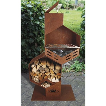 Aus Metall ist der Esschert Terrassenofen mit Brennholzfach XL, FF138 gefertigt. Wobei die Anfertigung aufgrund von seinem Design und den Formen eine Besonderheit ist. Farblich ist der Terrassenofen in einem rostigen Design. Der Esschert Terrassenofen verfügt über einen integrierten Grillrost sowie über einen Abzug. Am Boden verfügt der Terrassenofen über ein großes Brennholzfach, wo das Brennholz verstaut werden kann. Zusätzlich verfügt der Terrassenofen unter dem Brennholzfach über ein Fach für das Anfeuerholz. Das Gewicht vom Terrassenofen von Esschert beträgt 43.5 kg.