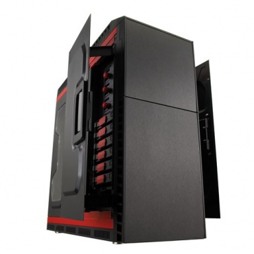 Die Optik dieses Midi Gehäuse entspricht den Vorgaben, die Spieler an solch ein Gehäuse stellen. Hier werden alle Voraussetzungen erfüllt die man sich als leidenschaftlicher Spieler erfüllen möchte. Werkzeugfreier Einbau der Komponenten ist vorbereitet und hier hat man am Ende einen Rechner mit hoher Leistung, den man sich individuell zusammen stellen kann. Die Seitenfenster erlauben den Blick auf die agierende Technik und diese Optik kann man mit erweiterbaren LED `s noch unterstreichen. Schwarz und rot so lässt sich schon erahnen welche Leistung in diesem Gehäuse am Ende steckt.