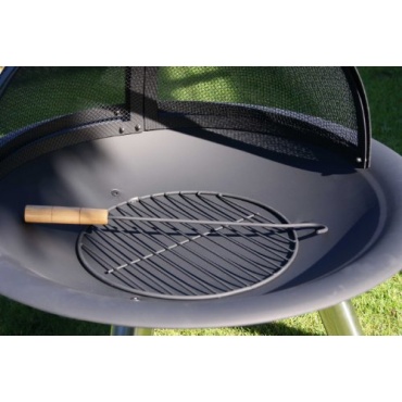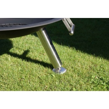 Die Feuerschale Adrianne hat einen Durchmesser von 76 cm. Sie besteht aus Stahl und wurde mit einem Hitzeschutzanstrich versehen. Die 3 Edelstahlfüße lassen sich verstellen und passen sich somit jedem Untergrund an. Das Besondere an dieser Feuerschale ist die abnehmbare Funkenhaube. Diese dient nicht nur als Schutz, sondern sorgt auch für ein bequemes Nachlegen von Holz, da sie sich beidseitig aufschieben lässt.