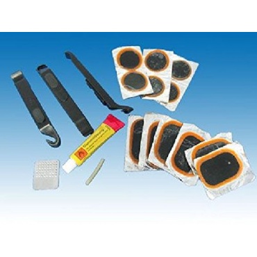 Das Set beinhaltet 3 Reifenheber aus Kunststoff, 10 ml Gummilösung, 6 rechteckige und 6 Rundflicken, 1 Aufrauer und 1 Ventil.