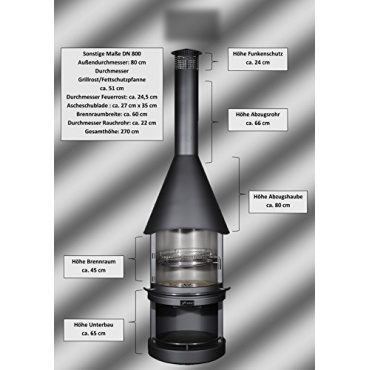 Verarbeitet aus Metall ist der Grillkamin. Der Grillkamin ist mit einem Rost aus Edelstahl und einer Fettaufwangschale ausgestattet. Damit während dem Grillen keine Wärme verloren geht, ist der Brennraum beim Grillkamin isoliert. So ist der Brennraum mit einer Dicke von 30mm Rockwoll gedämmt. Farblich ist der Grillkamin in Sugar-Braun gehalten, die Abmessungen vom Grillkamin betragen 80 x 80 x 270 cm bei einem Gewicht von 95 kg. Trotz dem hohen Gewicht, ist der Grillkamin einfach zu bewegen. So ist der Grillkamin mit Rollen ausgestattet.