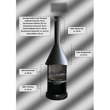 Der Grillkamin der Firma Firestar ist mit Gummirollen für den flexiblem Einsatz ausgestattet. Die etwa 80 kg Eigengewicht können dadurch leicht verschoben werden. Der Feuerraum beinhaltet feuerfeste Steine. Insgesamt besitzt der Grill eine Höhe von 215 cm und einen Außendurchmesser von 65 cm. Das Rauchrohr hat noch einmal einen Durchmesser von etwa 14,5 cm. Ein Grillrost gehört mit zum Lieferumfang und kann in vier unterschiedlichen Stufungen eingesetzt werden. Ein Aschekasten fängt die Reste eines Brandes auf.