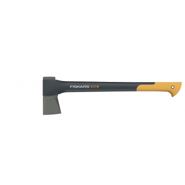 Die Axt wiegt 1680 Gramm und hat eine Länge von 65 cm. Die ausgeprägte Keilform spaltet das Holz besonders gut. Der Stiel besteht aus mit Glasfaser verstärktem Polyamid, ist hohl und nahezu unzerstörbar. Leicht angeraut liegt er gut in der Hand. Gehärtet ist die Schneide der Axt auf 55 Rockwell. Das bedeutet, dass man die Fiskars X17 leicht mit einer Feile schärfen kann und die Schneide wenig anfällig für Schneidenausbrüche ist.