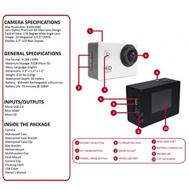 Die schwarze Fixing.DIY Full HD Helmkamera ist wasserdicht und hat zwölf Megapixel. Das Objektiv besitzt 170 Grad und ist ein HD Weitwinkelobjektiv. Die Auflösung der Fotos ist brilliant und farbenfroh und scharf. Zum Aufnehmen bei rasanten sportlichen Aktivitäten ist der Single Shot Modus perfekt.