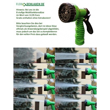 Mit dem FlexiSchlauch wird die Gartenbewässerung zum Kinderspiel. Zum einen überzeugt die einfache Handhabung, zum anderen die optimale Länge von 30 Metern. Somit können auch große Gartenanlagen einfach und unkompliziert bewässert werden. Der Wasserdruck wurde perfekt abgestimmt und liegt bei vier bis sechs Bar. (Richtwert) Zudem erhält man beim Kauf des FlexiSchlauchs eine praktische 8-stuftige Multifunktionsdüse, die das Bewässern nochmal wesentlich erleichtert. Mit FlexiSchlauch erhält man ein hoch entwickeltes Produkt für jeden Garten und jede Rasenanlage.