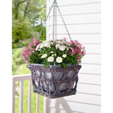 Die Pflanzampel von Frank ist eine wahre Blumenpracht. In einem viereckigen Weidkorb kommen die Pflanzen besonders gut zur Geltung. Der Korb ist in einem dunklen Braunton gefertigt und der Innentopf in einem leicht gewaschenen grau. Die geflochtene Blumenampel hat eine Gesamtlänge von 57 Zentimeter und beitet ausreichend Platz für Blumen.