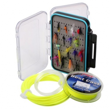 Enthalten sind in dieser Box eine Fliegenschnur in der Ausführung WF6-Schwimmend mit 100FT in Gelb, Fliegen 30 Stück, 5 Fliegen Vorfächer mit 9FT, etwa 2,75 m. Mit dieser Box hat man alles, was man für das Fliegenfischen braucht und dazu noch in guter Qualität und einer ebensolchen Verarbeitung. Mit diesen Fliegen wird man jeden Fisch anlocken und für einen einmaligen Fang sorgen. Das macht die Freude auf einen Angeltag gleich noch größer.