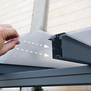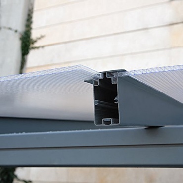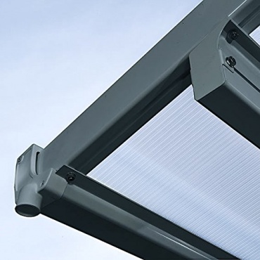 Das Gestell bestehend aus vier Pfosten, zwei Pfetten und den Dachsparren besteht beim Carport aus Aluminium. In das Gestell beim Carport ist Dachentwässerung integriert. Der Carport wird mit einem Dach aus Polycarbonat geliefert, was auch bruchsicher ist. Aufgrund der robusten und stabilen Verarbeitung, ist das Gestell nicht nur UV-beständig, sondern auch rostfrei und witterungsbeständig. Der Carport kann eine Schneebelastung von maximal 100 kg pro Quadratmeter aufnehmen. Farblich ist der Carport in Grau gehalten.