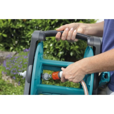 Die praktische Schlauchtrommel in klassischem Design verfügt außerdem über dreieckig konstruierte Seitenteilen, mit einem tief gelagerten Schwerpunkt. Durch diese kippt die Trommel weniger leicht nach vorne um und kann mit einer hohen Standfestigkeit überzeugen. Der integrierte Nachtropfstopp verhindert außerdem, dass nach dem Gebrauch oder beim Transport Wasser nachtropft. So wird einer Wasserverschwendung vorgebeugt und der Aufbewahrungsort stehts trocken gehalten. Mit der Gardena Schlauchtrommel lässt sich das gießen im Garten effektiv und vor allem angenehm gestalten.