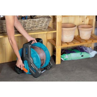 - Die Schlauchtrommel verfügt über einen ergonomischen Griff, einen abgewinkelten Schlauchanschluss mit Nachtropfstopp, eine freilaufende Handkurbel, sowie dreieckige Seitenteile mit tiefgelagerte Schwerpunkten für hohe Standfestigkeit.