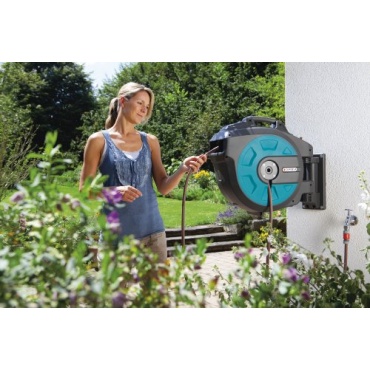 Die Gardena 8023-20 Comfort Wand - Schlauchbox verfügt über einen 25 m langen Qualitätsschlauch inklusive einer Spritze und den entsprechenden Systemteilen. Der Schlauch rollt sich gleichmäßig von selbst auf, sodass man keine Probleme mehr mit verdrehten Schläuchen hat. Die Schlauchbox kann an einer Wand befestigt werden und ist dort um 180 Grad schwenkbar. Weiterhin verfügt die Schlauchbox über einen Nachtropfstopp.