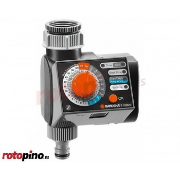 Die Bewässerungsuhr T 1030 wird am Wasserhahn angeschlossen. Sie steuert die automatische Bewässerung von drei möglichen Bewässerungsintervallen. Die Dauer eines Intervalls kann von einer Minute bis zu 120 Minuten ausgewählt werden. Über den großen Drehknopf wird die Startzeit eingestellt. Die Wochentage können einzeln zur Bewässerung programmiert werden. Eine 9 Volt Alkaline Batterie wird zum Betrieb der Bewässerungsuhr benötigt. Zudem wird der Batteriezustand angezeigt.