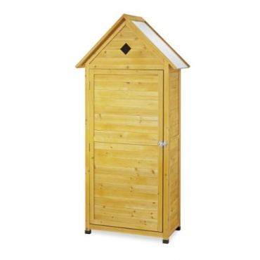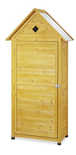 Der 82 x 45 x 178 cm große Garten-Geräteschrank ist aus hochwertigem imprägniertem Holz gefertigt, wodurch er witterungsbeständig und Wasser abweisend ist. Das verzinkte Blechdach und vier Kunststofffüße sorgen für zusätzlichen Schutz des Innenraums. Der Stauraum ist mithilfe von vier Einlegeböden flexibel gestaltbar, sodass auch große Geräte optimalen Platz erhalten. Für Besen, Schaufel und ähnliche Gegenstände bleibt ein 175 cm hoher Stauraum frei. Der Schrank lässt sich mit einer Tür samt Riegel verschließen.