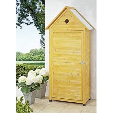 Das zauberhafte Design des Garten-Geräteschranks von Merschbrock Trade fällt im Garten oder auf der Terrasse sowie dem Balkon ins Auge. Das helle Holz ist ein ausgezeichnetes Material, welches nicht nur Wind und Wetter trotzt, sondern auch perfekt mit dem Design im Stil eines Holzhauses mit einem Giebeldach harmoniert. Praktischer variabler Innenraum und süße Akzente am Dach machen den großen Schrank zum Hingucker.