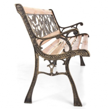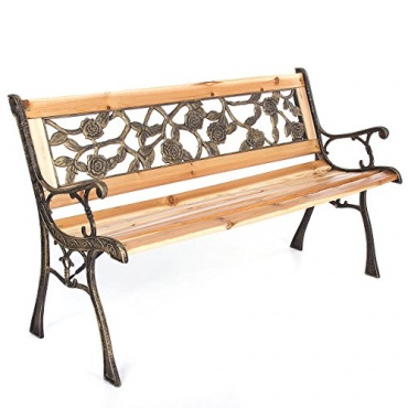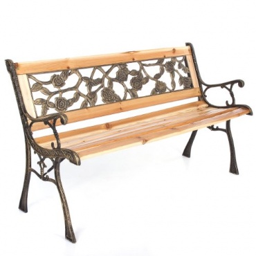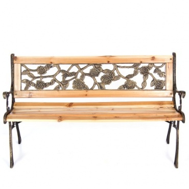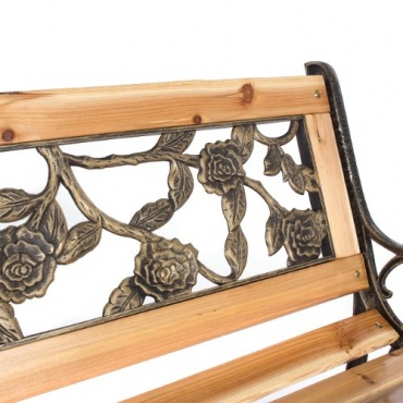 Die Gartenbank hat eine Länge von 122 cm, eine Höhe von 74 cm und eine Breite von 54 cm und wiegt 14 kg. Das Grundgerüst dieser Gartenbank besteht aus Gusseisen, die Sitzfläche und die Rückenlehne sind aus massivem Tannenholz gefertigt, welches lackiert wurde. In die Rückenlehne ist zudem eine Verzierung aus Kunststoff eingelassen, die ein schönes Rosendesign zeigt.