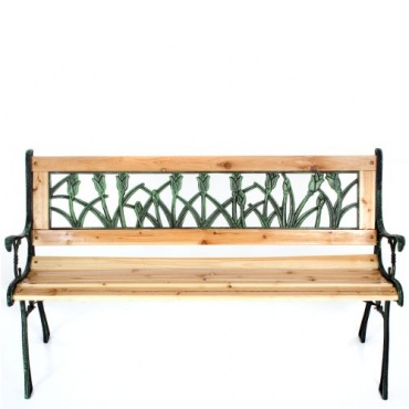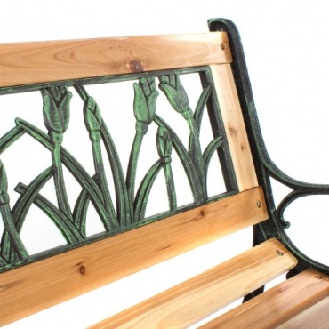 Die Gartenbank Homelux von Primopet überzeugt auf den ersten Blick vor allem durch ihr äußeres Erscheinungsbild. Besonders auffällig sind die Verzierungen an der Rückenlehne. Hier ist ein Tulpendesign aus Kunststoff angebracht. Das Gestell der Bank ist aus Gusseisen gefertigt, der Rahmen der Rückenlehne sowie die Sitzfläche sind aus massivem und lackiertem Hartholz.