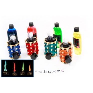 Es sind verschiedene Sets erhältlich, man kann selbst entscheiden, ob man das Set mit den gemischten Farben bevorzugt oder sich lieber für eine Farbe entscheidet. Die Farbe kann der restlichen Dekoration angepasst werden. Eine Kappe zum Löschen der Flamme ist vorhanden. Die Fackeln brennen sehr sauber und sind geruchsneutral. Die Lieferung erfolgt in einer Metallfackeldose mit Bambus-Dekor.