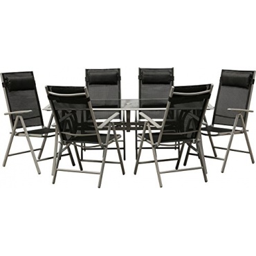Diese hochwertige Gartengarnitur passt durch das edle Design in jeden Garten. Der Tisch wird mit 6 passenden Stühlen inklusive Nackenkissen geliefert. Das Gestell von Tisch und Stühlen besteht aus matt silbernem Aluminium mit einer Pulverbeschichtung. Die Tischplatte besteht aus schwarzem Sicherheitsglas. Die Stühle haben eine Sitzfläche und eine Rückenlehne aus Kunstfaser, sowie ein abnehmbares Nackenkissen.