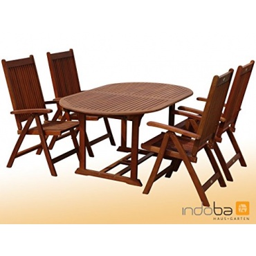 Die Gartengarnitur ist aus Eukalyptusholz gefertigt. Dieses ist witterungsbeständig und langlebig. Die Rücklehne der Stühle lässt sich 7-fach verstellen, sodass jeder seine optimale Sitzposition findet und sind mit Armlehnen versehen. Sie sind zudem platzsparend zusammenklappbar. Die Sitzgruppe ist ideal für die Terrasse geeignet. 4 Personen finden hier ausreichend Platz und man kann bei einem Essen gemütlich zusammensitzen. Die Sitzgarnitur ist schlicht gehalten und fügt sich schön in den Garten ein.
