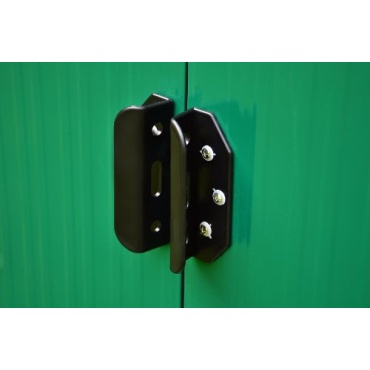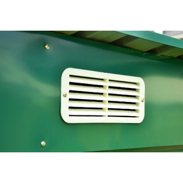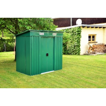 Die verzinkte Stahlblechkonstruktion des grünen Gartenhauses ist auf Beständigkeit und Langlebigkeit ausgerichtet. Das wetterfest Material in der Stärke von 0,25 mm ist wasserdicht, rostet nicht und hält jeder Belastung z.B. Schneelasten stand. Das Gesamtgewicht von 47 kg lässt das Haus standfest stehen. Zwei Belüftungsöffnungen sorgen für Luftzirkulation. Mit den Maßen von 195 x 122 x 181 cm entsteht eine großzügige Innenfläche von 2,38 m², die durch eine Doppelschiebetür erreicht wird. An der Tür ist die Konstruktion für ein Vorhängeschloss angebracht. Im Inneren ist ein verzinkter Bodenkranz aufgebaut, der mit einem Boden bestückt werden kann. Der Boden ist nicht im Lieferumfang enthalten.