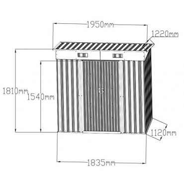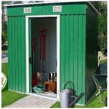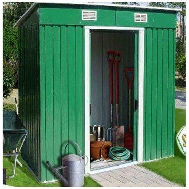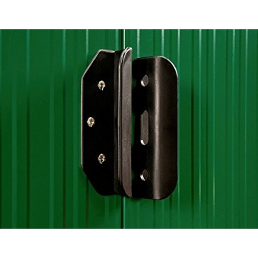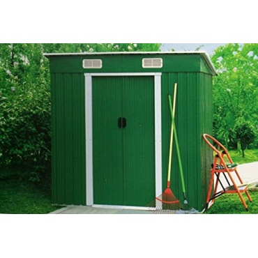Die verzinkte Stahlblechkonstruktion mit Fundament des grünen Gartenhauses leistet maximalen Widerstand gegen Wind und Wetter. Das äußerst robuste Material mit einer Wandstärke von 0,25 mm ist wasserdicht, rostet nicht und mit dem hohen Gewicht von 44 kg auch standfest. Aufgrund der Maße von 195 x 122 x 181 cm ergibt sich eine großzügige Innenfläche, die durch die 59,5x154 cm große Öffnung einer Doppelschiebetür erreicht wird. An die Tür kann ein Vorhängeschloss angebracht werden. Zwei Belüftungsöffnungen sorgen für Frischluft, was vor allem beim Abstellen von Geräten notwendig ist.