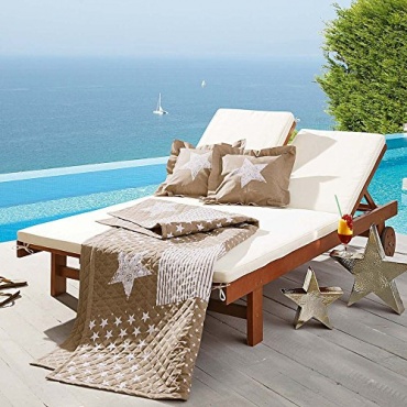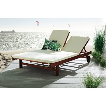 Die Gartenliege ist aus Eukalyptusholz gefertigt. Sie ist 200 cm lang, 120 cm breit und 37 cm hoch und somit für 2 Personen geeignet. Am Kopfende der Sonnenliege sind 2 Rollen mit einem Durchmesser von je ca. 20 cm angebracht, wodurch sie sich leicht bewegen und umstellen lässt. Eine 7 cm dicke, cremefarbene Auflage ist im Lieferumfang enthalten.