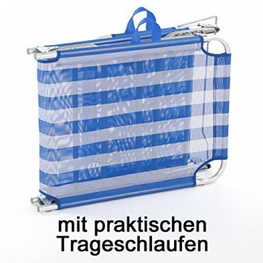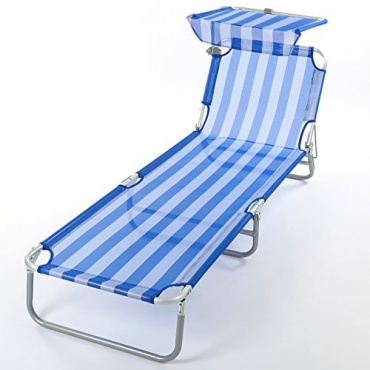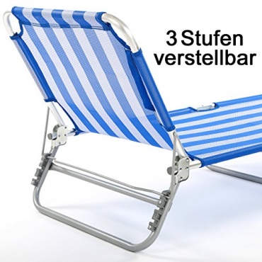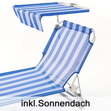 Diese Liege hat einen Bezug, der aus Nylon besteht. Zudem kommt noch das Gestell hinzu. Dieses besteht aus Aluminium. Das Sonnendach kann verstellt werden und schützt besonders den Kopf vor den schädlichen Sonnenstrahlen. Damit wird auf jeden Fall ein Sonnenstich vermieden. Ein weiterer Pluspunkt liegt auch in der Rückenlehne. Der Nutzer kann auf der Liege sehr gut entspannen. Die Liege ist praktisch und lässt sich vor allem sehr einfach aufklappen.