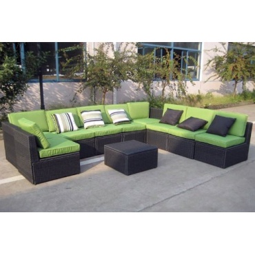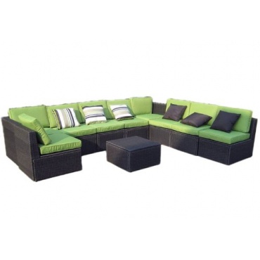 Die 10-teilige grüne Gartenlounge zeichnet sich durch ihre stabile und robuste Verarbeitung und ihrem funktionellen Design aus. Diese witterungsbeständige Sitzgruppe ist besonders für die Terrasse oder einem schattigen Platz im Garten geeignet. Aber auch in einen Wintergarten oder ein Wohnzimmer passt sie ausgezeichnet.