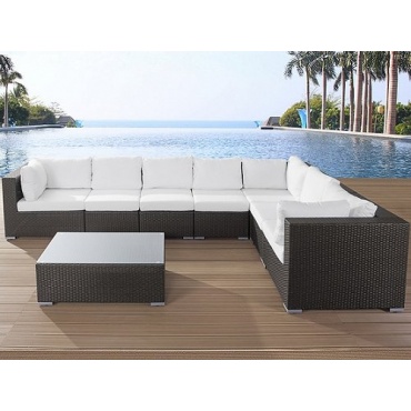 Das rostfreie, stabile Gestell der 26-teiligen Gartenlounge ist aus pulverbeschichtetem Aluminium gefertigt und mit einem Geflecht aus Polyrattan bespannt. Diese Rattan ähnliche Kunststofffaser ist extrem stabil und extra für Gartenmöbel entwickelt. Es ist Schmutz abweisend, UV-lichtbeständig und einfach zu reinigen. Auch die mitgelieferten hellbeigen Polster und Kissen sind extrem pflegeleicht. Die Flüssigkeit abweisenden Polster und Kissen haben Überzüge mit einem Reißverschluss.